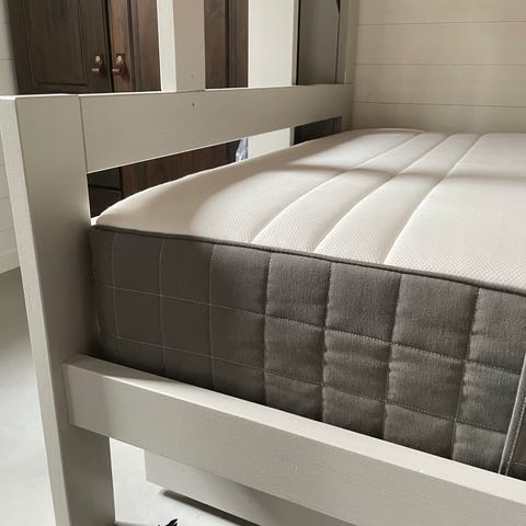 IKEA-säng med ribbotten och två separata madrasser, vit stomme och ljusa madrasser med grå kant. Stabil ram med trälameller under som ger bra stöd.