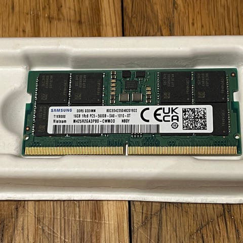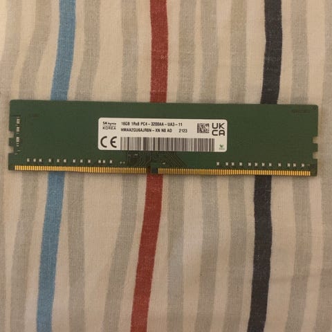 Säljer ett RAM-minne för stationär dator, vanlig DDR5-sticka på 8GB. Passar i standard DDR5-plats med guldpläterade kontakter längs kanten.