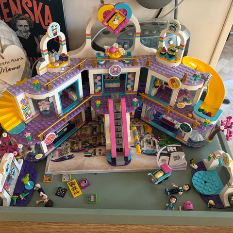 LEGO Friends-hus med flera våningar, butiker och små rum i olika färger. Följer med flera minifigurer, fordon och bygginstruktionshäften som syns på bilderna.