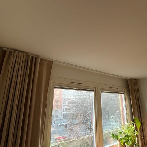 Takskena med dubbla spår och med gardiner från Jotex och Hemtex, en skir vit som heter Otto och är från Hemtex och en beige mörkläggningsgardin från Jotex som bägge hänger på skenan. Passar bra till större fönster eller balkongdörr, ger både insynsskydd och ljusinsläpp.