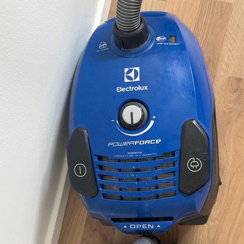 Electrolux UltraOne Green dammsugare med reglerbar styrka via vred på ovansidan. Har flera inställningar för olika golvtyper och indikator för påsbyte.