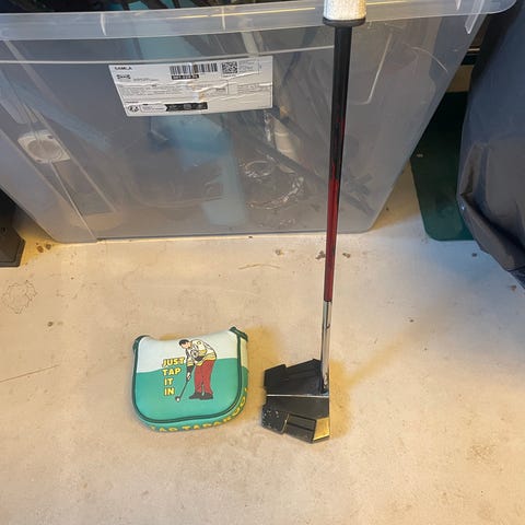 Odyssey Red Ball putter med svart grepp och vit slagyta. Huvudet har röd, vit och svart design med sikthjälp bak.