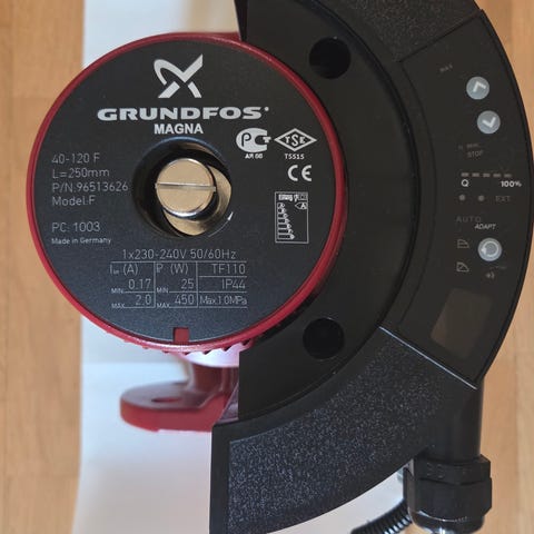 Grundfos Alpha2 25-40 cirkulationspump för värmesystem, sitter monterad på kopparrör med mässingskopplingar. Har kabel med kontakt och enkel knapp för styrning på ovansidan.