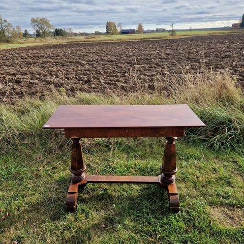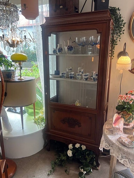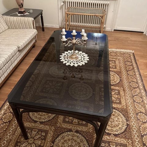 Vackert gammalt bord med 2 avtagbara glashyllor. Höjd 75 cm, diameter 55 cm. Fraktkostnad efter överenskommelse.