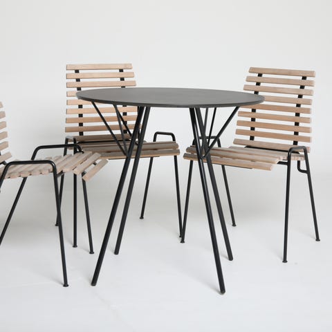 High Tech matgrupp bestående av två High Tech stol i varmförzinkat stål och High Tech matbord Ø60 cm i varmförzinkat stål, bordsskiva i vit kompaktlaminat. Industriell form när den är som bäst. Enkel, funktionell och stringent med ett tidlöst designspråk. High Tech-serien ritades av Nisse Strinning år 1985 och bjuder på strikt komfort. Perfekt för balkongen eller den lilla uteplatsen.
