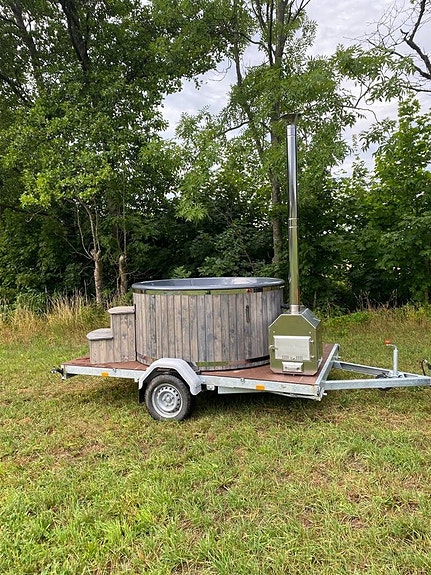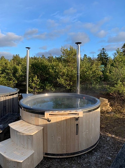 Hyr en vedeldad badtunna på 80 km släp med plats för ca 5-7 personer.