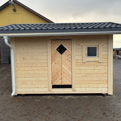 Kraftigt byggt ATTEFALLHUS med måtten 4,1 x 6m.inklusive taköverbyggd altan. Regelstomme 45 x 95mm. Golvåsar 45 x 145mm. Takstolar 45 x 195.Spikad i block för enkel montering. Timmerpanel utvändigt, pappad & klar för isolering. Trossbottenskivor ingår samt golvspånskivor, takplåt (tegelprofil) Rännor & rör, nockplåt, fotplåt, vindskiveplåt, dörr 18 gr, kopplat fönster. Kort sagt: Det du ser på bild exteriört ingår. Fler modeller finns att se i vår utställning. Eller gå in i BLOCKETBUTIKEN.