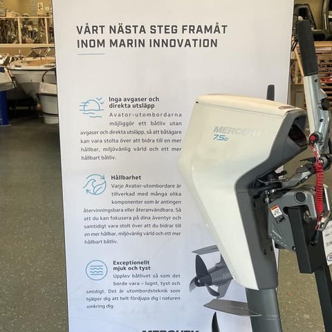 NYHET - Mercurys nya elmotor på plats. Med sin avancerade motor och effektiva prestanda, producerar Avator 7.5e 750W kraft vid propelleraxeln. Den klarar hastighet och acceleration likt en Mercury 3,5 hk fyrtaktare. Den första i Mercurys Avator serie.