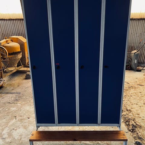 Sonesson blåa omklädningsskåp delade med stativ och sittbänk