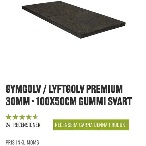 Träningsgolv, CE märkta enligt EN 14041 standarden. CE märkning är obligatoriskt för dessa produkter. Detta golv är i mycket hög kvalité och gymgolvet är 30 mm tjockt för bra dämpning. Golvet är tillverkat i Europa och vi har sålt mycket av detta golv till gym hemmagym och crossfitboxar Gymgolvet är framtaget för att ligga stilla på golvet när man släpper vikter på dem! Du behöver inte limma fast dem på golvet då golvet väger 27 kg styck