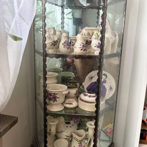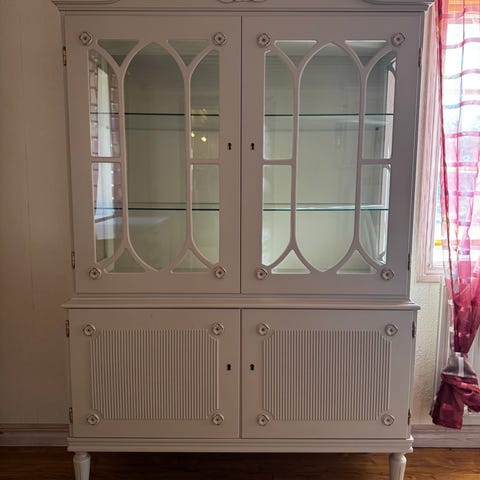 Vackert gammalt skåp målat i en grå/grön nyans. Fräscht inuti och fint skick. Hyllor uttagbara. Höjd 179 cm, bredd 82 cm, djup 37 cm. Fraktkostnad efter överenskommelse.