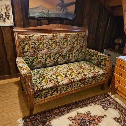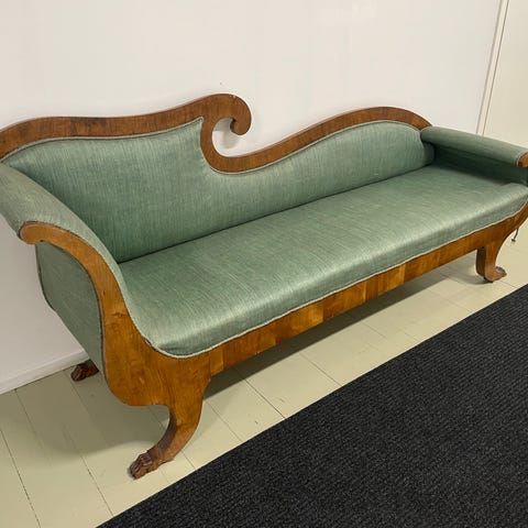 Charmig liten soffa i gott skick. Höjd 72 cm, bredd 97 cm, djup 43 cm. Fraktkostnad efter överenskommelse.