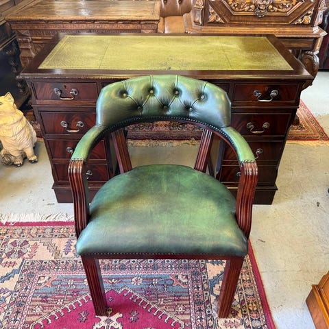 Engelskt skrivbord med passande skrivbordsstol. Skrivbordet har skinnklädd skiva i grön färg. Stolen är klädd i grönt läder. Möblerna är i bra begagnat skick.