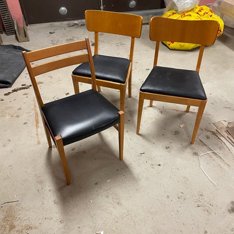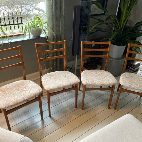 Fint skick. En har en gammal lagning för övrigt i fint skick. Höjd 73,5 cm, sitthöjd 45 cm, sits 46x49 cm. 4 st säljes tillsammans.
