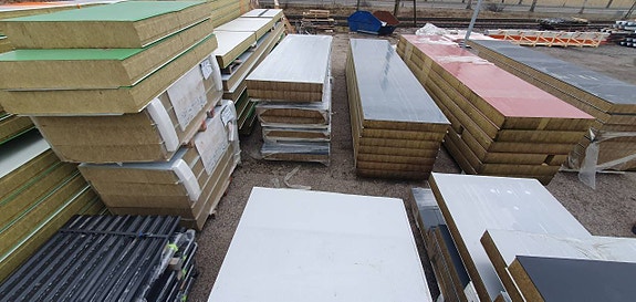 Sandwichpanel (väggpanel) mineralull• 2:a-sortering• OBS, nyanser och profiler varierar inom samma pall och färg.• Bredd 1,2m om inget annat anges(Färgerna anges enligt: utsida/insida)#### Säljs per helpall enligt nedan: ####Bild 3:200mm Olackad/vit• Pall 1: 6st 5,98m195kr/m²Bild 4:200mm Blandat mörkgrönt & olackat• Pall 2: 4st 5,98m195kr/m²Bild 5:SÅLDABild 6:SÅLDABild 7:300mm Mix, täckbredd 1,2m• Pall 7: 4st Vit/vit ca 5,98m• Pall 8: 2st Brun/vit + 3st 3st Blygrå/vit• Enstaka: 1st Vit/vit 5,98m• Enstaka: 1st Blygrå/vit 6,0m275kr/m²Bild 8:240mm blandfärger, täckbredd 1,2m• Pall 9: 5st Blandlängder 3,56… –> …6,17m• Pall 10: 4st Blandlängder 5,15m… –> …6,31m250kr/m²#### PRISER INKL. MOMS! ####