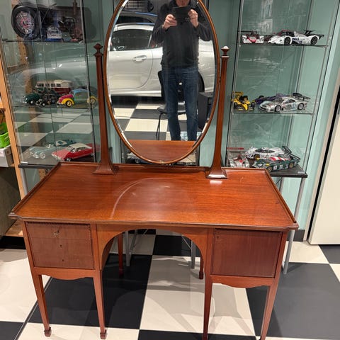 Vackert sminkbord ifrån Halvdan Pettersson, 50 tal i fint skick. Höjd 70 cm, bredd 100 cm, djup 36 cm. Fraktkostnad efter överenskommelse.
