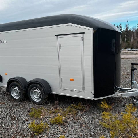 Bromsat skåpsläp med glasfibertak och front.