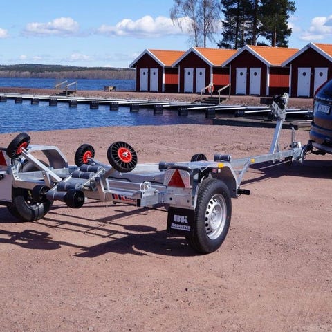 Båtvagn med självjusterande vagga på baksidan och manuellt justerbara främre stöd för maximalt stöd för båten. Ramen är helt svetsad och varmförzinkad. Stålskärmar som tål 200 kg gör det enkelt att komma upp på båten när du är på land. Högmonterade lyktor som inte bör tas bort under lanseringen.