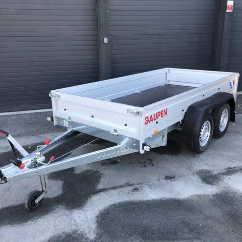 Utrustad med fällbara lämmar runt om, lastöglor i golvet och på utidan runt om, stödhjul, handbroms.