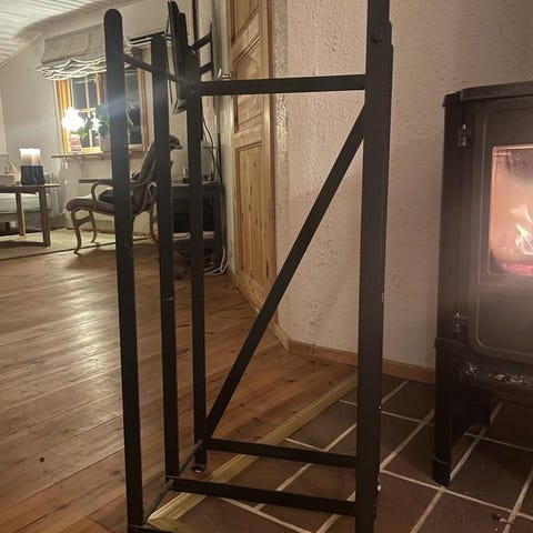 Härligt vedställ i metall med praktisk låda undertill