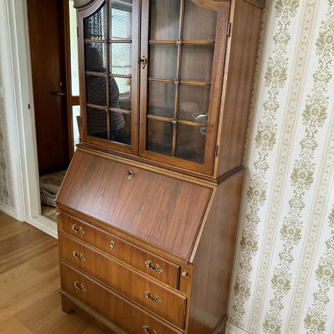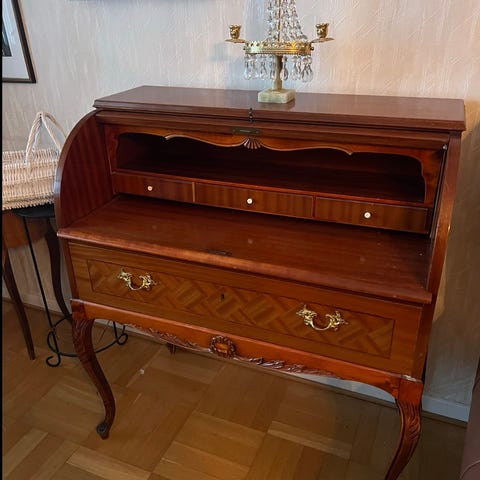 Invändigt finns flera små lådor och skåp för förvaring, samt en rymlig skrivyta när den är utfälld.