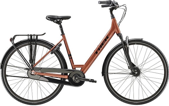 Favorit har sju växlar, skivbroms fram och fotbroms bak. Den är utrustad med skärmar, belysning, ramlås, ringklocka och cykelstöd, samt en pakethållare med AVS-funktion, där du kan klicka av och på korgar, väskor och andra AVS-tillbehör.