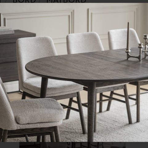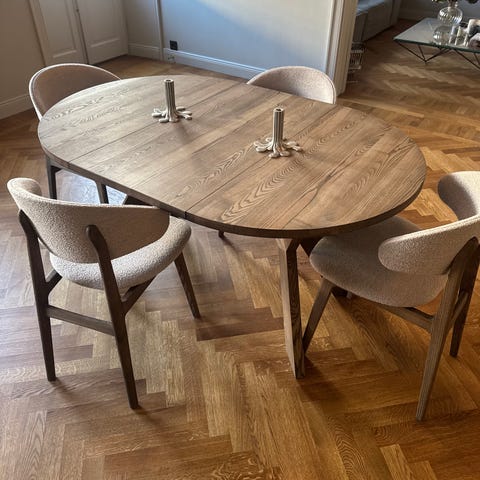 Maddock bord i vacker ekfaner,(går att slipa ,extra tjock faner) svarta ben i metall,135 cm i diameter går att förlänga med 2 st skivor, som ingår i detta pris. Tot längd 235 cm. Detta ex till detta pris. Stolen på bilden heter Waterton kostar 1495:-/st