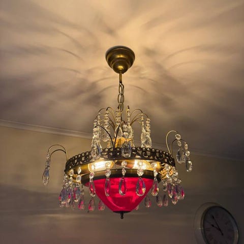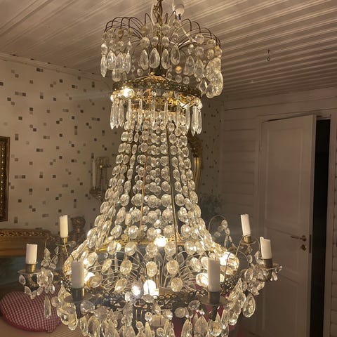 Kristallkrona i gustaviansk stil i fint skick. Alla prismor finns kvar och lampan sprider ett magiskt sken i rummet. Med sina 7 elektriska ljuskällor och 6 stearinljushållare blir den både praktisk och stämningsfull – perfekt som rummets mittpunkt.