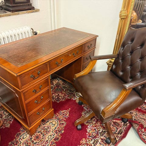 Engelskt skrivbord i klassisk design med en elegant karmstol i grönt läder. Perfekt för ett sofistikerat kontor eller hemmakontor!