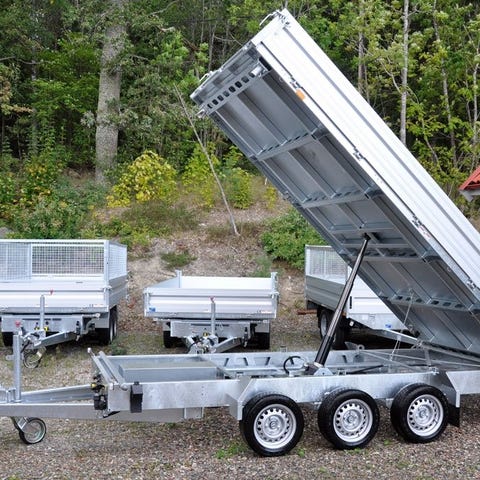 Martz trevägstipp är ett tippbart släp byggd på en kraftig helsvetsad flakbotten. 4 leds-kulkopplingar möjliggör tippning bakåt eller sidor.