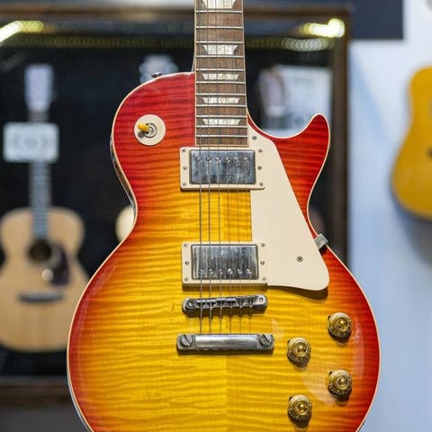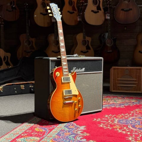 Very Good condition, 7,5/10, Made in USA, including brown original hardcase, some dents and wear in the finish,no fret wear, in the case is a warranty card for a different guitar so perhaps it was mistaken when sold new as it is from the correct year (model LPCS, serial 012726, warranty card dated 11/7/01 which is November 7th 2001), this model was built 2001 - 2004, more specs: solid body, maple top, Body: mahogany Top: flat, flame maple Neck: mahogany Fingerboard: 22-fret rosewood Neck Pickup: 490R alnico humbucker Bridge Pickup: 498T alnico humbucker Hardware: gold finish Bridge: tune-o-matic Tailpiece: stopbar Controls: 2 volume, 2 Tone, 3 way toggle switch Width just in front of nut: 1.69 in. (43 mm) Depth middle of 1st fret: .866 in. (22 mm Width middle of 12th fret: 2.067 in. (52.5 mm) Depth middle of 12th fret: .925 in. (23.5 mm)