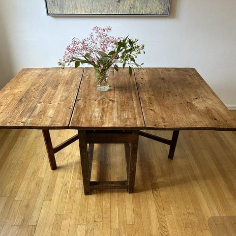 Charmigt gammalt bord. Höjd 69 cm, bredd 90,5 cm, djup nedfällda klaffar 48 cm. Klaffar 21,5 cm x 2. Fraktkostnad efter överenskommelse.