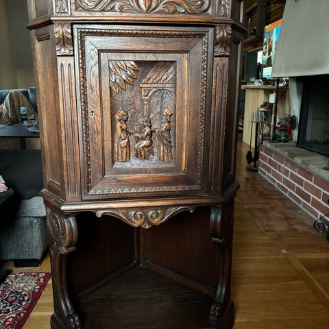 Äldre litet skåp på ben med förvaring och låda