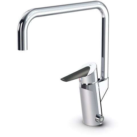 MORA IZZY köksblandare med högt pip och tvågreppsfunktion. Utrustad med keramiska överstycken, strålsamlare för 13 l/min samt svängbar pip (120° eller 360°). Material av mässing och koppar, förkromad yta. Hålstorlek för installation: Ø29-37 mm. Anslutningsrör med slätända.