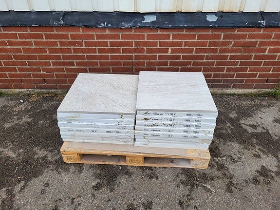 Snygg granitkeramik som installerats i Bilmånssons bilhallar. 75x75 cm stora. Klarar biltrafik utan problem.