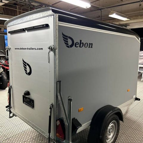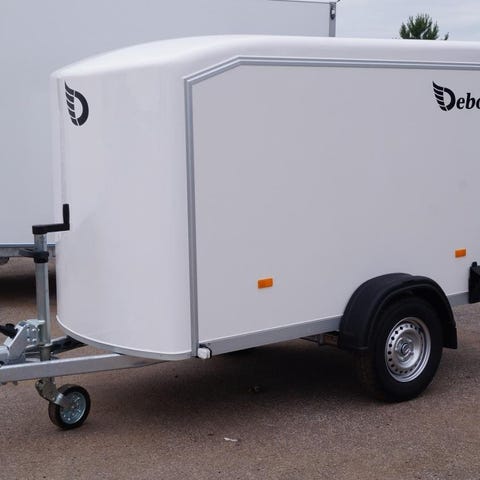 Bromsat skåpsläp med glasfibertak och front.