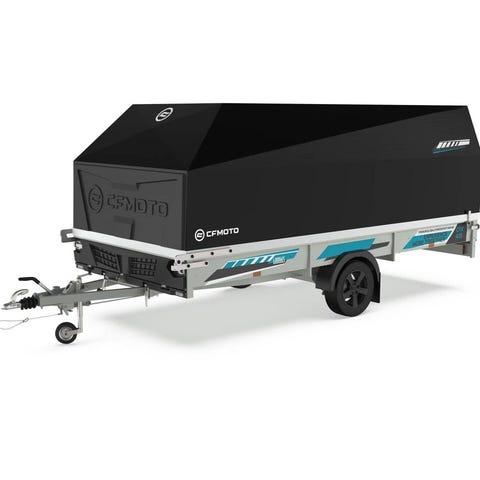 Bromsad släpvagn med aluminiumkåpa. Utrustad med snyggt stenskottsskydd på framläm & kåpa med CFMOTO logotyp, snöbåge i kåpa, innerbelysning , plastskydd på hjulhusen & bakläm.