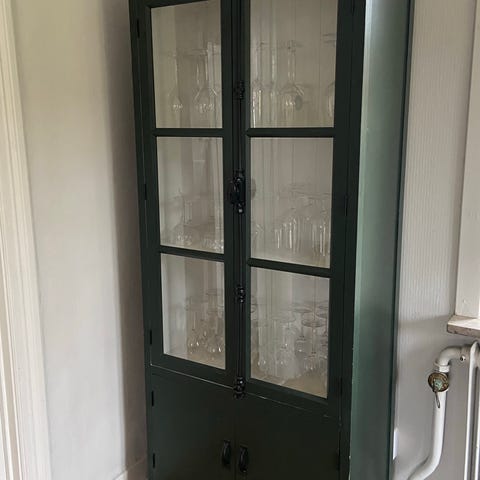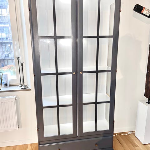 SE HIT!!!!! FYND LÄGE!! Vi har köpt in ett större parti av dessa fina vitrinskåp till mycket bra pris,har kostat ca 14000:-färdigmonterade i kartong,massivt trä grålaserat ,dubbla dörrar med vacker spröjs, sidoljus med spröjs,samt låda längst ner,3 st hyllplan i 6 mm slipat glas.Finns för omg leverans,måtten är