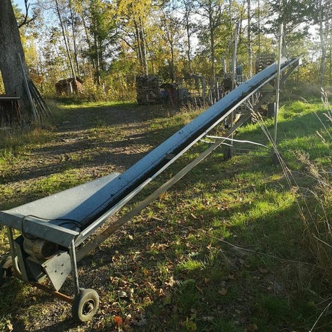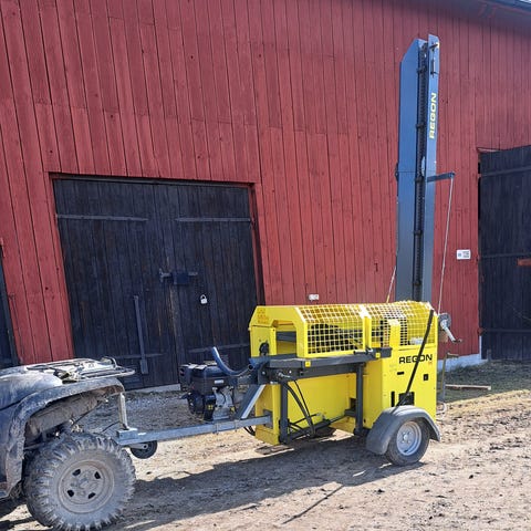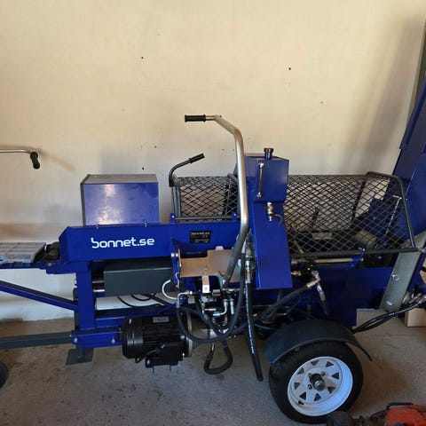 Suverän maskin med matarband som är vridbart i sidled för lättare upplag av veden.
