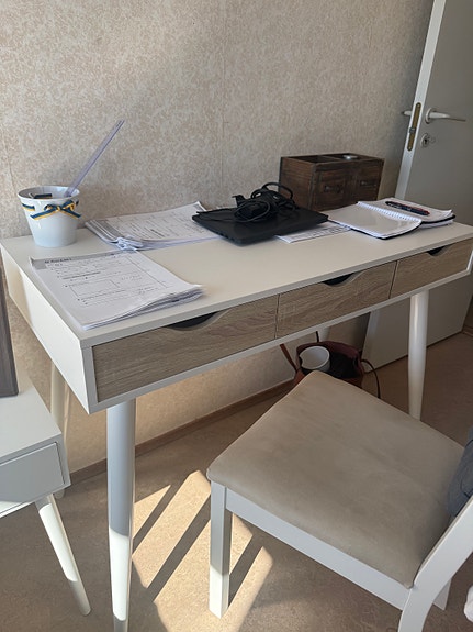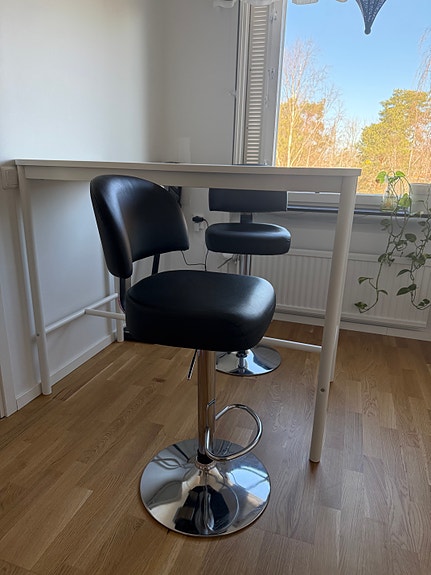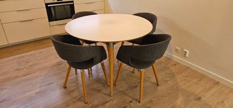 1 500 krMatgrupp runt bord med vit skiva och fyra grå tygstolar träben MioHuddinge2 minLägg till i favoriter.