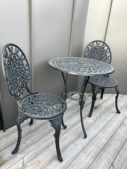 1 000 krSvart caféset utebord äldre med två stolar i gjutjärnNacka2 minLägg till i favoriter.Öppna annons