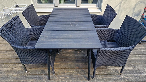 1 500 krSvart konstrotting matgrupp med stolar och glasbord för uteplatsLidköping15 timLägg till i favoriter.Öppna annons