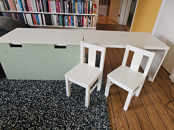 350 krIkea skrivbord för barn, leksakslåda, två stolar IKEAHuddinge4 timLägg till i favoriter.Öppna annons