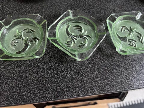 150 krFem små gamla askfat i grönt glasHöör8 decKöp nuLastbil i rörelseKan skickasLägg till i favoriter.