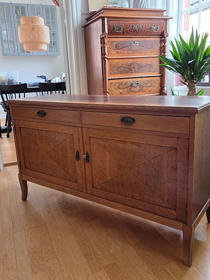 4 900 krMatgrupp med utdragbart matbord, stolar och sideboard i mörkt träArlöv29 marLägg till i favoriter.