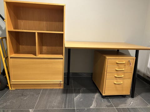 skrivbord, bokskåp,stol