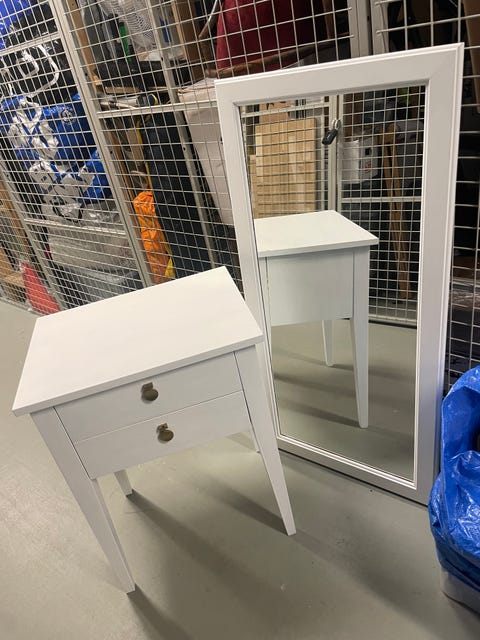 Vintage byrå i trä med tre lådor och vita och trä ornament