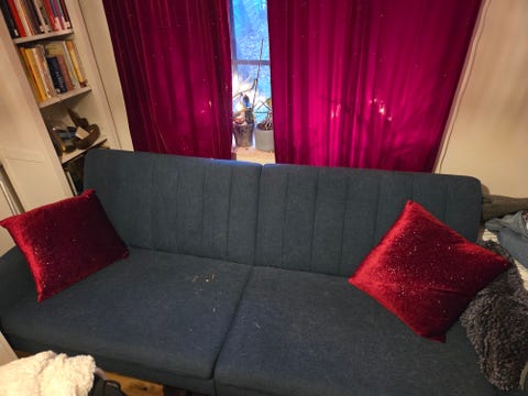 Blå bäddsoffa med två kuddar