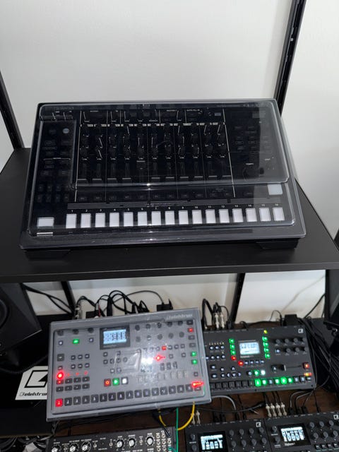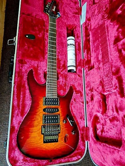 Boss och Mad Professor gitarrpedaler på pedalbord med nätdel