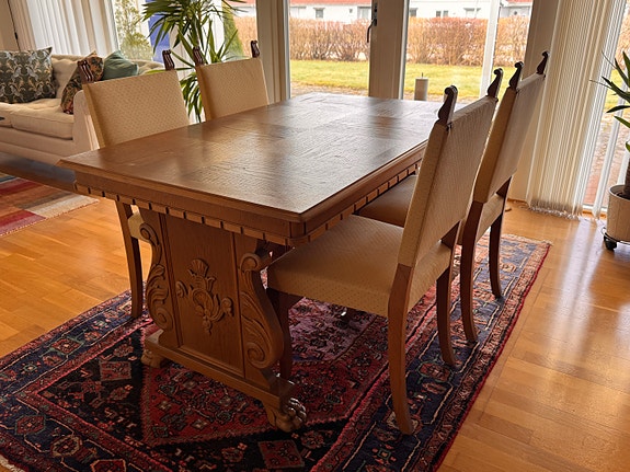 8 000 krStort gediget matsalsgrupp med 8 stolar i ming dynasty stilVessigebro2 minLägg till i favoriter.